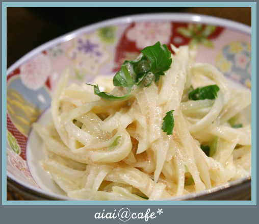 チャチャッと和えてできあがり〜!な1品の登場です。ジャガイモの歯触りがポイントなので、サッとお湯にくぐらす程度に茹でるのがコツ。少し使ったら余っちゃう(^-^;)持て余し気味な三つ葉をここで一気に消費しましょう(笑)人気blogランキングへ。 「三つ葉とジャガイモの明太子和え」【材料】3人分*ジャガイモ2個(せん切り)*三つ葉1/2束(粗みじん切り)*明太子又はタラコ1/2腹(薄皮からこそげる)*マヨネーズ大さじ2*プレーンヨーグルト(無糖)大さじ1*醤油小さじ1/2★ジャガイモはスライサーでせん切りにします。【作り方】 1.【茹でる】 湯を沸かし、塩を少し入れてジャガイモを茹でます。 サッとくぐらす程度でOK。 10数えたら引き上げ、ザルに上げて水にさらして よく水気を切っておきます。2.【和える】 ボウルに調味料を入れてよく混ぜ、 そこへジャガイモ、三つ葉、明太子を入れて混ぜ合わせます。 器に盛ったらできあがり。ダーリン、実はたらこや明太子が苦手なんですよね(^-^;)生臭みがダメらしくて、しっかり火を通してポロポロになったものだったらOKなんです。方や娘と私はたらこ&明太子大好き♪あれは生で食べるもんだと思ってるから…ダーリン「明太子フランスは全然OK!あれはアンパンの次にウマい和製パンだな。」娘「え〜!明太子は生がウマいに決まってるやん!明太子フランスなんて邪道だよ〜(´〜`;) 」いつもこういう終わりの無い会話が繰り広げられます(笑)ま、好みは人それぞれ。今回のおかずは、三つ葉の香りや少し垂らしたお醤油が臭みを消したのかダーリンも黙々と食べてくれたからヨシとしましょう!(^-^)さて、今日はこれから夏ものを引っ張り出す予定。お天気はピーカン!立夏は目の前ですね(*^-^*)