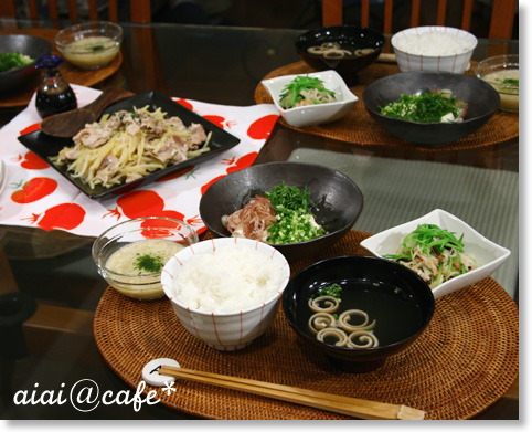 「きぬさやとカニカマの柚子胡椒和え」【材料】3人分*きぬさや10枚程度*カニカマ6本*塩昆布(細切りタイプ)ひとつまみ*白締め油(太白ごま油)又はサラダ油小さじ1*柚子こしょう適宜【作り方】 1.【下準備】 きぬさやはサッと色よく茹でて水に取り、 千切りにする。 カニカマはほぐす。2.【和える】 ボウルに柚子胡椒と白締め油を入れてよく混ぜ、 きぬさや(飾り用を少し残す)とかにかま、塩昆布を加えて和える。 器に盛り、上にきぬさやを添えて完成。塩昆布は、和えてすぐよりも少し間を置いて、水気を吸わせた方がいい味が出るみたい。いや〜、調味料としてホントいい仕事してくれます(ウンウン)白締め油は、胡麻を炒らずに絞った油です。胡麻の香りは全然しないんですが、コクがあって、火を通さずに調理するものには相性がいいんですよね。混ざりにくい柚子こしょうを、これで少し緩めてから和えます。油は入ってると感じないくらいの量ですし、艶も出ておいしそうに仕上がりますよ〜(*^-^*)この日は薬味いっぱいの冷や奴、長芋とろろ、ジャガイモの炒め物などなど。ダーリンのお誕生日ディナーが終わって、少しカロリー抑えめのメニューが並びました。おいしそう〜♪と思ってくださったら、 ←_ρ( ̄  ̄*)ポチッ♪と一押し応援どうぞよろしくお願いします!