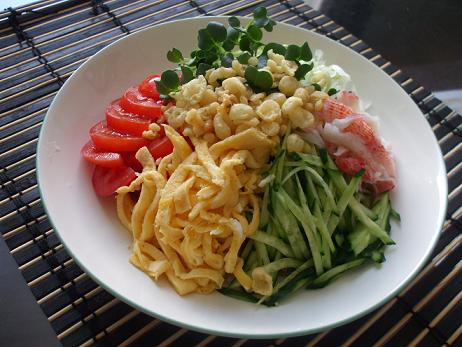 全国的に暑いみたいですが、北海道はどんよりとした日が続いています。今日も暖かいのですが、なんかパッとしなくて・・・これはこれで嫌なもんですね。休みの日にはパッと晴れてくれて、最近始まったビアガーデンを楽しみたいものです!って、引越したから、かなり街から離れてしまっていますが(笑)材料:そば(乾麺) 150g卵 1個水溶き片栗粉 少量塩 少量きゅうり 1/2本貝割れ大根 1/3パックトマト 1個カニかま 2個長ネギ 1/3本揚げ玉 適量Aだし汁 1カップしょうゆ 大さじ2みりん 大さじ2柚子こしょう 小さじ1/21、Aは鍋で煮立てて冷ましておく。冷めたら柚子こしょうを溶かし混ぜておく。2、きゅうり、長ネギは千切りにし、長ネギは水にさらす。トマトは縦に半分に切り、スライスする。貝割れ大根は根を取り、1/2にカットする。3、卵に水溶き片栗粉、塩を加えよくかき混ぜ、フライパンで薄く焼く。火から離しながら、焼くというよりも表面を乾かす感じで焼くと失敗しにくいです。4、そばはやや柔らかめに茹で、冷水で締める。5、器にそばを盛り付け、2の野菜、3の卵を千切りにしたもの、ほぐしたカニかまを載せる。6、最後に揚げ玉をのせ、お好みの量のタレをかけて出来上がり。ポイント卵は水溶き片栗粉を入れることで、破れにくくになり薄焼き卵を作りやすくなります。夏になると食べたくなるのがこういう冷製麺ですよね!最近ではコンビニでもこうした一工夫したものもたくさん売られていますが、やはり自分で作るっていうのがおいしいはずです。タレを作るのが面倒なら、麺つゆを薄めたものでもいいですし、乾麺でなくても作れますので手作り冷製麺をご自宅で食べてみてください。