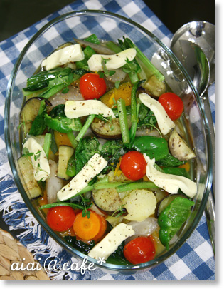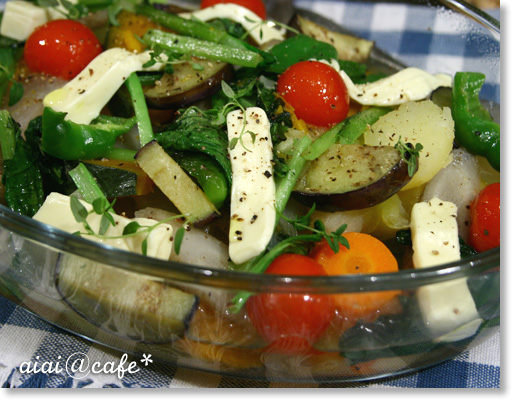 これは逆に、変わった洋風料理が好きな方におすすめよ(笑)と言っても、スープだけで煮て味付けは塩コショウのみ。とても優しい味で、お年寄りから子供まで食べていただける超おいしい野菜料理なのです( ^ー゚)♪ 残念ながらレシピはaicafeのレシピ本(39ページ)のみに掲載です。(ごめんなさいね〜!)が!ここでワタクシ大発見をしてしまいました〜〜〜〜!!レシピ本の材料の中に訂正箇所が1つ…【訂正】39ページ、『ベジスープ煮・とろけるカマンベール』の材料(一番最後)*ユズの皮適宜→必要ありません。このお料理にユズの皮は使いません!なぜユズの皮が??(-_-;)たぶん一緒に掲載されている鯛そうめんに使うから混じっちゃったのか…(滝汗)レシピ本を買ってくださった方にはご迷惑をおかけして本当に申し訳ありません!この場を借りて、訂正してお詫びしたいと思いますm(_ _)mさて、気を取り直して続きです(^-^;)ベジスープ煮、レシピ本では7種類くらいの野菜を使ってますが、今回はかぼちゃや茄子なんかの秋野菜もプラスして、9種類の野菜を使用。野菜がおいしいのはもちろんのこと、スープに旨味がたっぷりと出て、娘、一人で器をかかえて、傾けながら1滴残らず飲んでました(笑)
