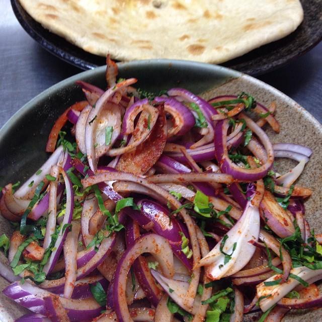 玉ねぎのサラダ。激辛でございます。汗がでました。日本では、生のたまねぎあまり食べないようですが、紫玉ねぎは苦みも少ないので、生で食べるにはオススメです。