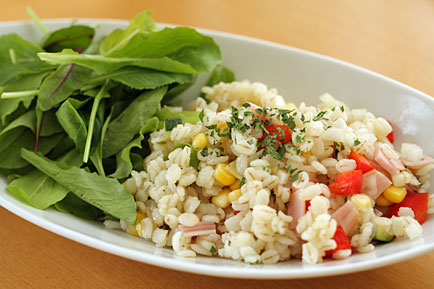 カルシウムやビタミン、食物繊維を豊富な健康食材「押し麦」を使ってお野菜たくさんサラダです。