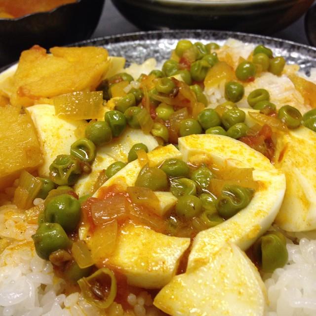 じゃがいもグリンピースゆでたまごのカレー。健康上の理由で、たまごの黄身は禁止なので、白身のみでございます。