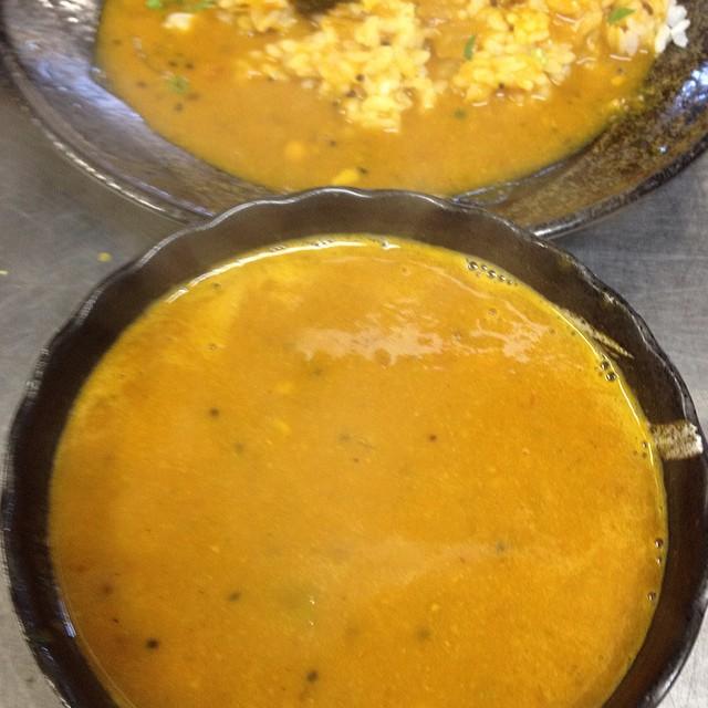 「ゴハンとセットでついてくる」的な意味合いで、南インドの味噌汁的な位置づけのスープ。味は味噌汁とはほど遠く、スパイシーな味わいです。見た目は黄色い汁ですが、野菜がたくさん入っています。時々、ものすごく食べたくなります。