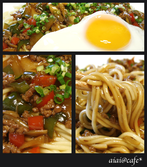 ミンチとあり合わせの野菜をあんにして、茹でた中華麺にかけただけ(^-^;)