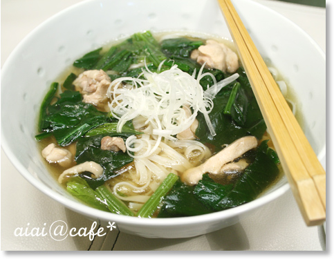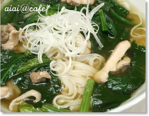 ほうれん草がたっぷり入った、チキンベースの温か麺です。