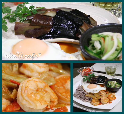 おかずは、*茄子の酒蒸し・黒ごまソース*カニカマとキュウリ、セロリの柚子胡椒和え*エビとレタスのエスニックソテーそしてイチゴのデザート付き♪どれもパパッとできるものばかり。でもワンプレートにするとなんだか豪華に見えるのよね(*^-^*)